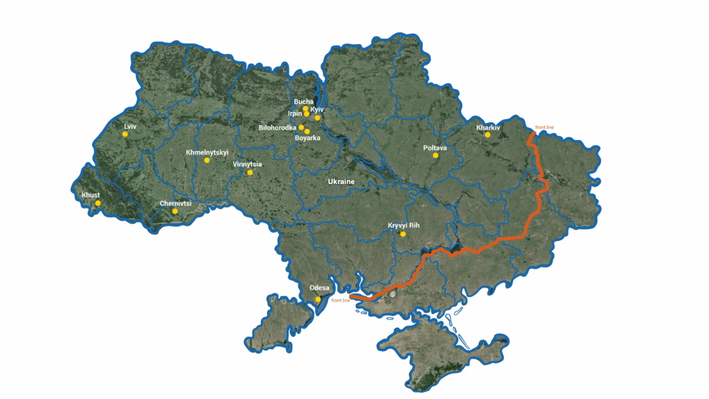 Ryc. 1. Uczestnicy projektu pochodzą z różnych miejscowości w Ukrainie. Na mapie zaznaczono rozkład geograficzny uczestników kursu inspekcji drzew.