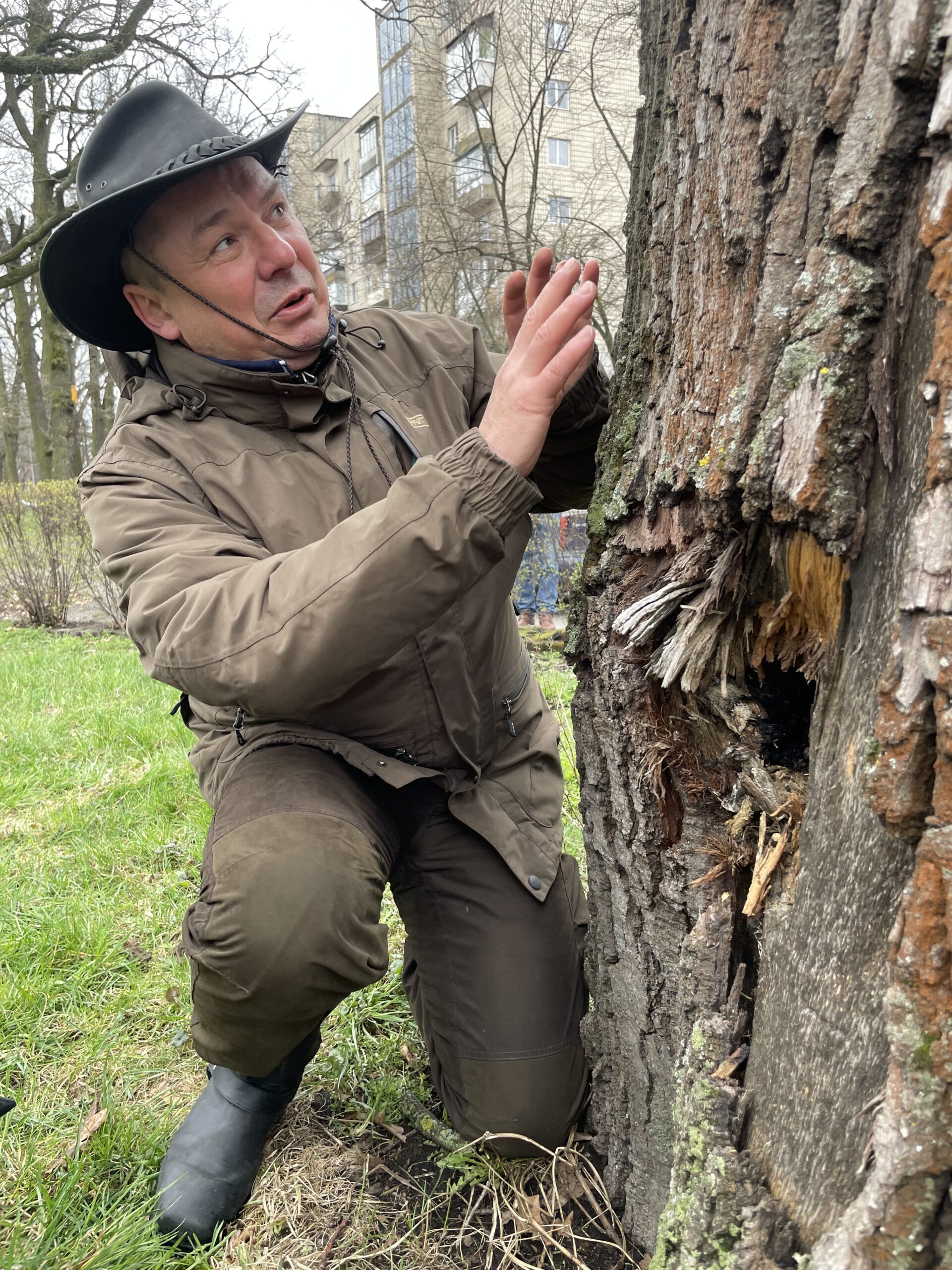 Fot. 5. Robert Albrekht, arborysta z Zakarpacia, pracuje na sędziwej wejmutce w rozdolskim parku.