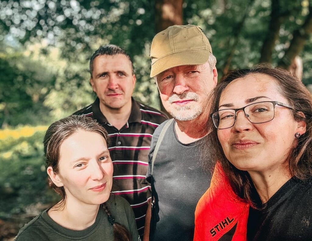 Fot. 7. Praca w Parku Rozdole, od lewej do prawej: Olena Vakarenko – Fundacja Semen Oblomei, Yuriy Kulievych – ukraiński tree worker, Jerzy Stolarczyk – Instytut Drzewa, specjalista VetCert, Hanna Havryliv – EFI Group, autorka zdjęcia).